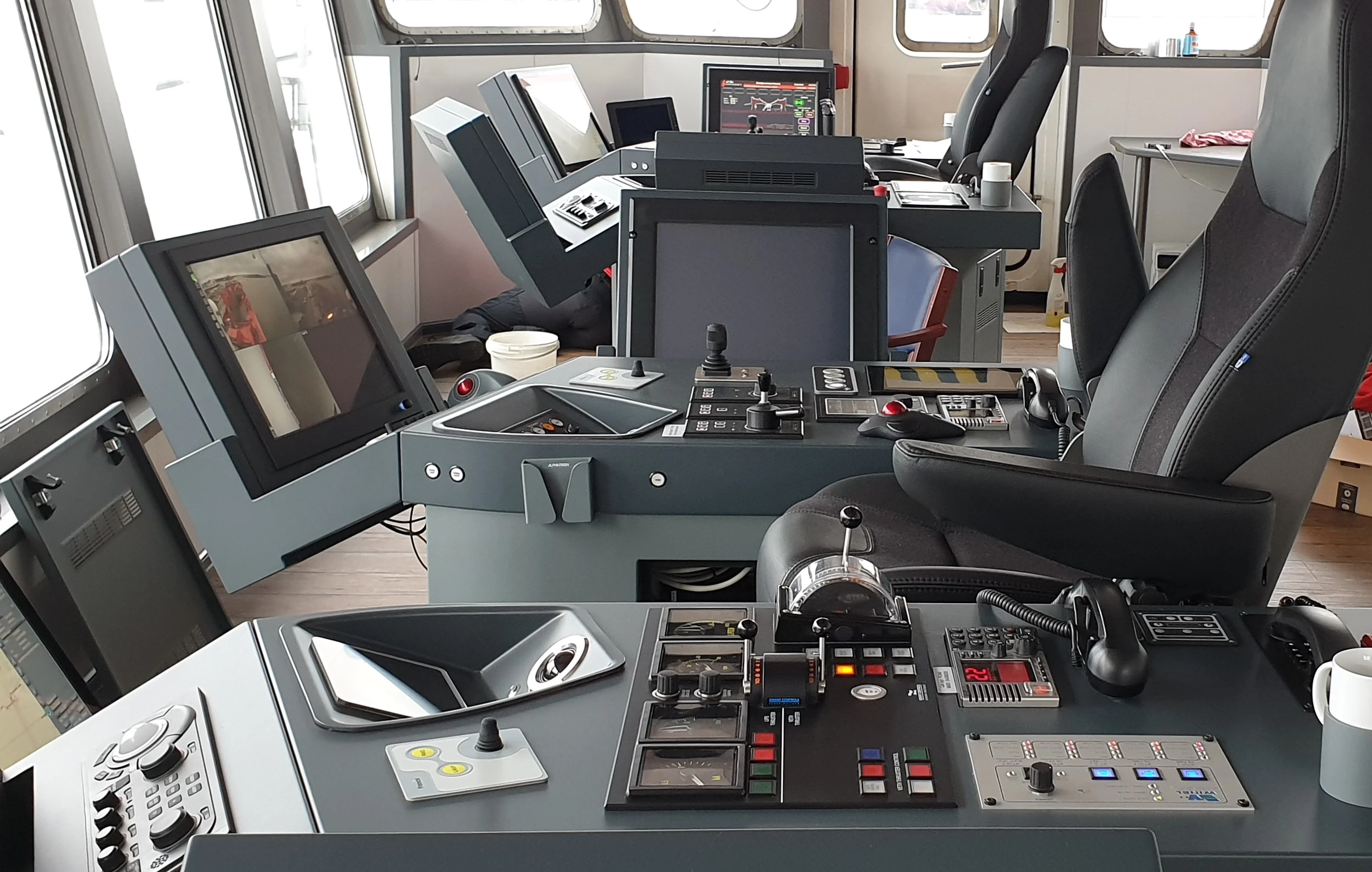 After the visit of captain Francis Hirs and Marcel and Robert Spaansen, the idea was born to adapt two tugboat consoles in such way that it could accommodate all equipment for sole navigation and create a specialized position for the dredging activities. As a solution we designed a custom AlphaBridge together with the ship’s captain. It is the Alphabridge concept that gives this project extra impetus because the total image has been given shape in good cooperation with the captain. It is a custom bridge environment in which all instruments for both navigation and dredging work are optimally designed around the captain with great ease of use and good readability as conditions. This to reduce the captain's workload as much as possible.