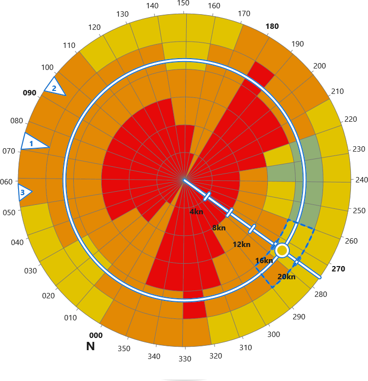 When APRS issues a warning signal, the crew can quickly assess the situation using the polar diagram. The vessel’s heading and speed are plotted alongside the three largest detected waves, ranked by their energy and displayed with their respective directions.