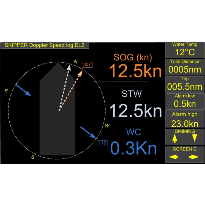 The SKIPPER DL2, developed by SKIPPER, is a dual-axis Doppler speed log designed to deliver precise and reliable vessel speed information. Using Doppler technology, the system measures both Speed Through Water (STW) and Speed Over Ground (SOG), including longitudinal and transversal motion, as well as distance relative to seawater.