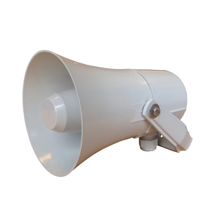 10W plastic loudspeaker. Small and Light. Suitable for outdoor installations, made of Ronfalin C110 - (PC+ABS). Plastic or stainless steel bracket. M-20 glands. 70/100 V transformer with variable power adaption.