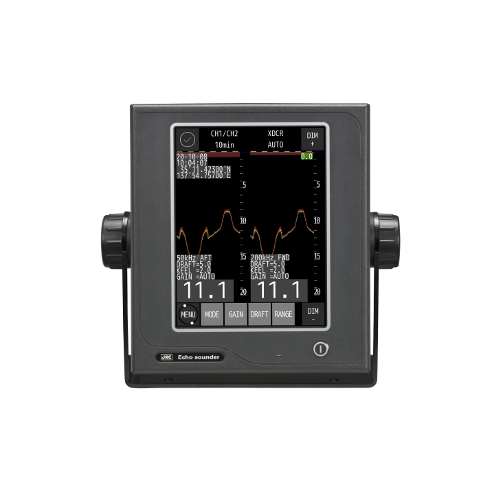 JRC’s new echo sounder is equipped with another ship’s interference prevention function. It is possible to prevent misidentification of interference waves from other ships. This is especially effective when many small vessels are sailing closeby. The separate model JFE-400 echo sounder incorporates printer adaptability. JRC’s new echo sounders incorporates a 6.5-inch high visibility color touch panel LCD. The display modes allow you to select and view echoes in 8 colors or 8 levels of monochrome. The compact connection box can be installed out of sight. An optional dual frequency configuration, 50 kHz or 200 kHz, allows you to operate both frequencies independently or simultaneously, or allows you to have a separate bow-stern depth read-out.