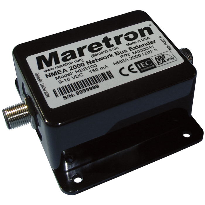 Maretron's NBE100 (Network Bus Extender) extends the maximum node count, network trunk length, and cumulative drop length of any NMEA 2000® network. It effectively addresses bus errors and electrical issues resulting from surpassing these limits, simplifying the design of large networks. NMEA 2000® networks typically allow up to 50 nodes, a maximum network trunk length of 200m, and a cumulative drop length of 78m.