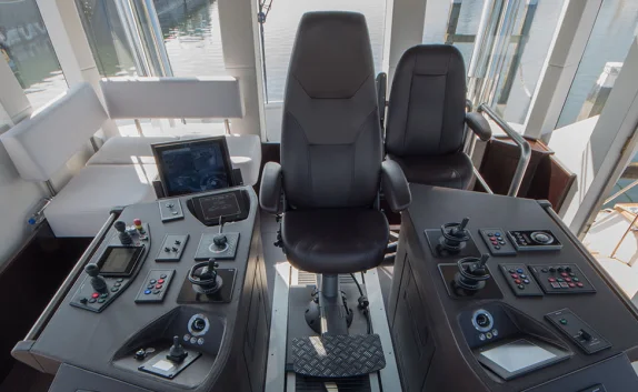The AlphaBridge for tugboats is distinguished by an optimized all-around visibility offered from a sitting position, ensuring uncompromised command and control at all times during intensive harbor operations. The AlphaBridge comprises two ergonomic and dynamically designed consoles with a centrally-placed chair for the captain, mounted on rails, which can be turned 180 degrees to face either direction. The display arrangement ensures that the screen functions are always in the same position.