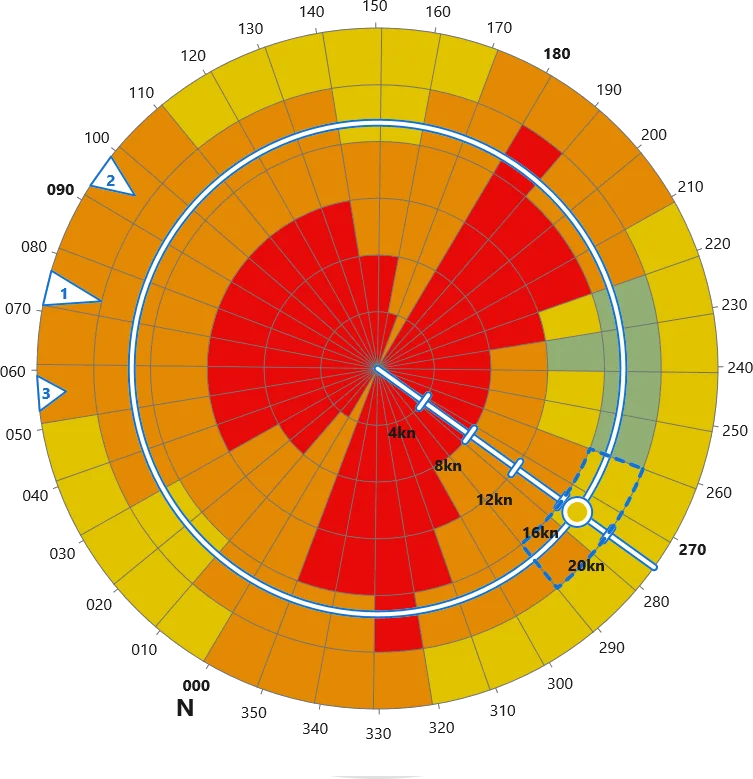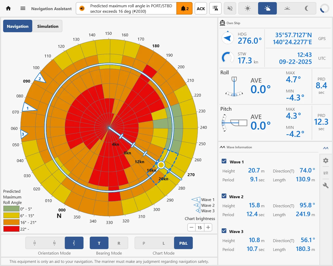 When APRS issues a warning signal, the crew can quickly assess the situation using the polar diagram. The vessel’s heading and speed are plotted alongside the three largest detected waves, ranked by their energy and displayed with their respective directions.