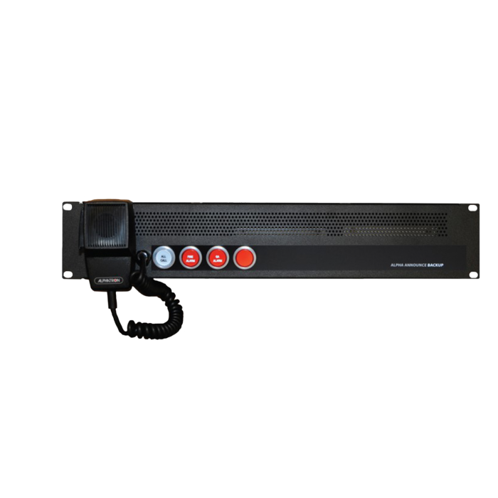 The standard system comprises of an eight-channel digital amplifier, a line transfer unit to supply 100V constant output and a back-up panel. The standard power is 2x 320W continuous, with physically separated A and B circuits and dual power supplies and alarm/tone generators to ensure operation in case of any single failure. For passenger vessels and vessels with large crew a dual rack A & B system is available where all components are redundant. The A system is the master controlling both systems, in case of failure the B system will automatically become the master. Up to 64 AlphaAnnounce Digital amplifiers can be combined to create PA/GA systems up to 40kW and up to 512 zones with numerous control panels.