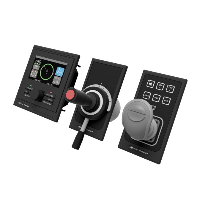 The complete DynaPilot MFM system exists of a MED type approved MFM autopilot and a joystick, control computer and control unit. Standard number of control stations that can be connected to the Control unit is limited by 3 (e.g. one main bridge and two wing stations). The system can use the same sensors as the autopilot, the number of sensors and position reference systems that can connected in total is 8. Depending on the ship’s propulsion equipment, the installation can be provided with follow-up and non-follow-up tillers, and extra control displays on multiple steering positions.