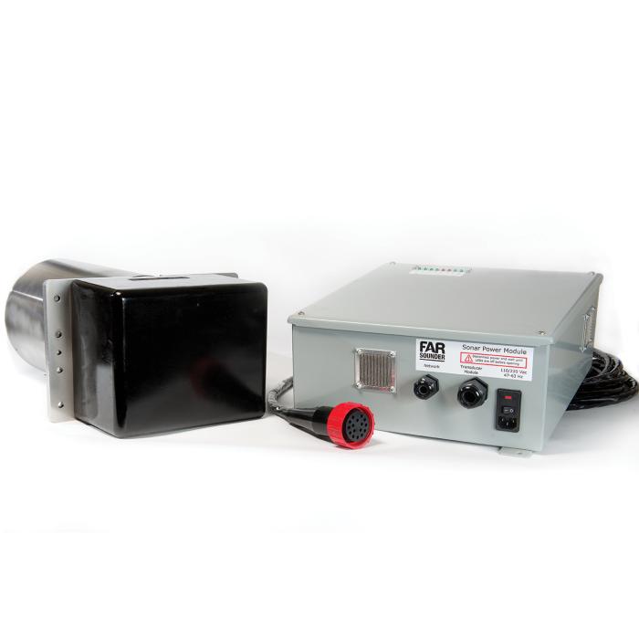 FarSounder's latest navigation product offers the user the ability to select between a wide field-of-view or an extended range mode. The system can operate with a 90° field-of-view out to 1500' (500 meters) range or a 60° field-of-view out to 3000' (1000 meters) range. he Transducer Module's array face is curved in the horizontal and includes nearly 200 receivers and a separate transmitter. The array is encapsulated in a rugged urethane designed to provide years of protection to the transducer elements. Above and below the urethane are thin steel plates to provide added protection from debris and the anchor chain.The FarSounder-1000 is available in two different Transducer Module options. The SH5 Transducer Module has a curved face. The SH6 Transducer Module has a flat face.