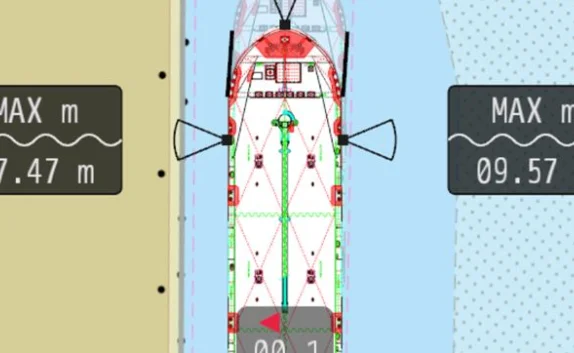One of the most innovative features for inland shipping is ‘lock approach’. In this function two so-called ‘lock lines’ are shown, which indicate from the outside ship what the path of the ship is for the coming minutes. These dynamically drawn lines are used to indicate when entering a lock whether the ship is sailing in the correct direction and speed.